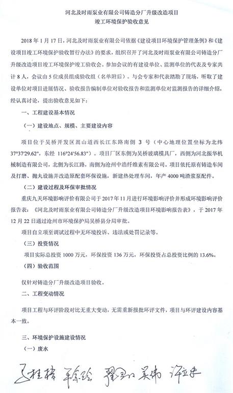 河北及時雨泵業有限公司鑄造分廠升級改造項目竣工環境保護驗收意見公示-河北及時雨泵業有限公司